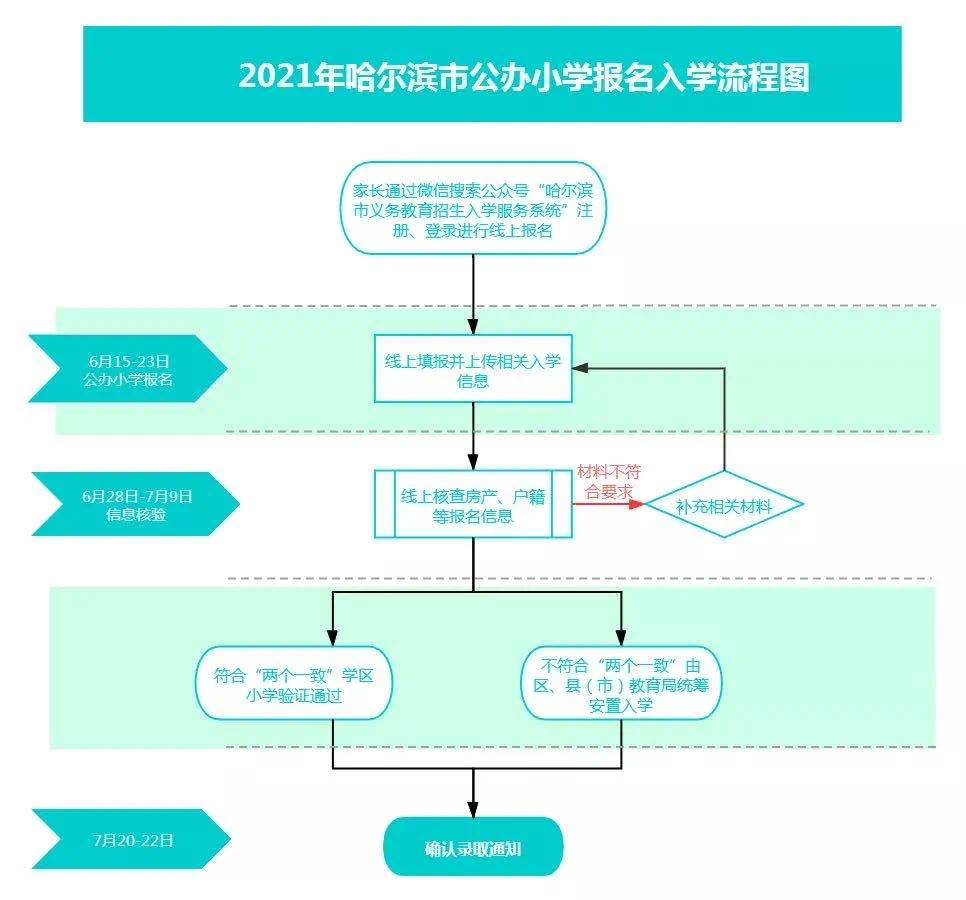 公办义务教育学校招生继续使用“哈尔滨市义务教育招生入学服务系统”,网上公布招生信息,通过信息化手段进行入学信息采集、核验,实现义务教育学校招生入学的公开、透明、便利、高效、快捷。6月15-23日,在“哈尔滨市义务教育招生入学服务系统”进行网上报名、信息采集。6月28日-7月9日,进行报名信息核验。7月20-22日,完成公办小学录取确认工作,并陆续发放公办小学入学告知信息。(部分时间安排可能会根据实际需要进行调整,如有调整将提前进行通知)