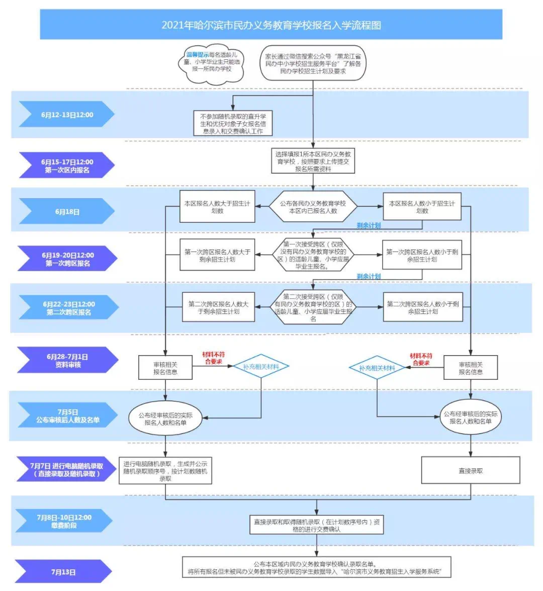 以下为拟定时间安排,可能会根据实际需要进行调整,如有调整将提前进行通知,并由区、县(市)教育局在“黑龙江省民办中小学校招生服务平台”公布。6月12-13日12:00,完成不参加随机录取的直升学生和优抚对象子女报名信息录入和交费确认工作。6月15-17日12:00,家长通过“黑龙江省民办中小学校招生服务平台”,选择填报1所本区民办义务教育学校,真实、完整、清晰地提交报名所需要的所有资料,报名截止后不得变更或放弃已选择的民办义务教育学校志愿。6月18日,公布各民办义务教育学校已报名人数。6月19-20日12:00,对本区内报名人数少于招生计划的,排名前列次接受跨区(仅限没有民办义务教育学校的区)的适龄儿童、小学应届毕业生报名。6月21日,公布各民办义务教育学校排名前列次跨区报名人数。6月22-23日12:00,对排名前列次跨区报名人数少于剩余招生计划的,第二次接受跨区(仅限其他有民办义务教育学校的区)的适龄儿童、小学应届毕业生报名。6月24日,公布各民办义务教育学校第二次跨区报名人数。7月5日,公布各民办义务教育学校经审核后的实际报名人数和名单。所有经审核通过的适龄儿童少年,获得参与民办义务教育学校电脑随机录取资格。7月7日,进行直接录取和随机录取。对本区报名人数不超过民办义务教育学校招生计划的,区、县(市)教育行政部门选择直接全部录取。对跨区(1-2次)报名人数少于剩余计划数的,也选择直接全部录取。对于本区报名人数超过招生计划数的民办义务教育学校,实行电脑随机录取,随机录取比例为招生计划(进行电脑随机录取计划数)的100%。由电脑随机生成录取顺序号,公示录取顺序号,按计划数顺次录取。跨区(1-2次)报名人数超过剩余招生计划数的,按剩余招生计划数100%实行电脑随机录取,由电脑随机生成录取顺序号,公示录取顺序号,按计划数顺次录取。7月8-10日12:00,对直接录取和取得随机录取(在计划数序号内)资格的学生进行交费确认,未在规定时间内交费的视为放弃录取,对放弃录取的名额,以短信、电话等形式按随机录取序号顺次通知家长交费,在7月12日15:00前录满(完)为止。7月13日,由区、县(市)教育行政部门在“黑龙江省民办中小学校招生服务平台”公布本区、县(市)民办义务教育学校确认录取名单。
