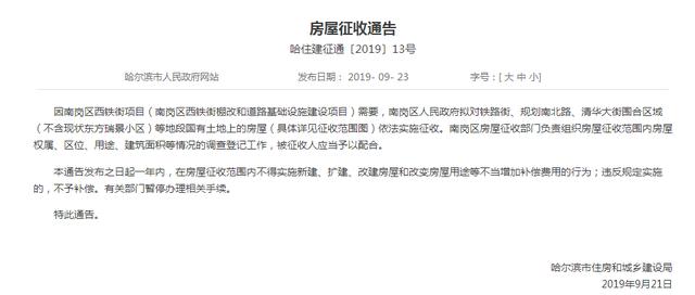 23日,哈尔滨市人民政府连发两条房屋征收通告。通告内容提到,南岗区人民政府拟对南岗两片区域的国有土地上的房屋依法实施征收。